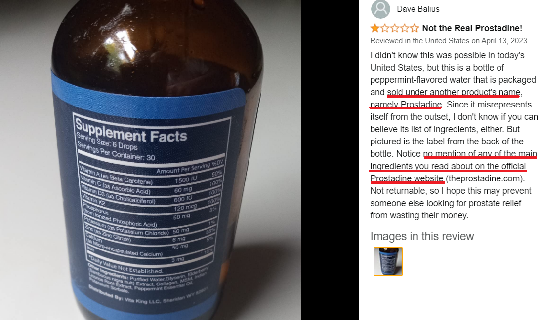 Here’s an example of a customer who bought a fake bottle of Prostadine through Amazon. As you can see, you can’t buy the real Prostadine on Amazon, since it’s only sold through the official site.