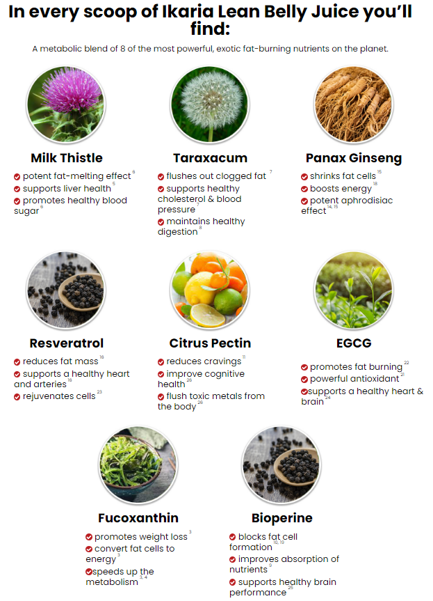 From ginseng and resveratrol to blue berry and beet root, the 100% natural ingredients in Ikaria Lean Belly Juice have been carefully selected to improve weight loss, digestion, and increase long-term energy.